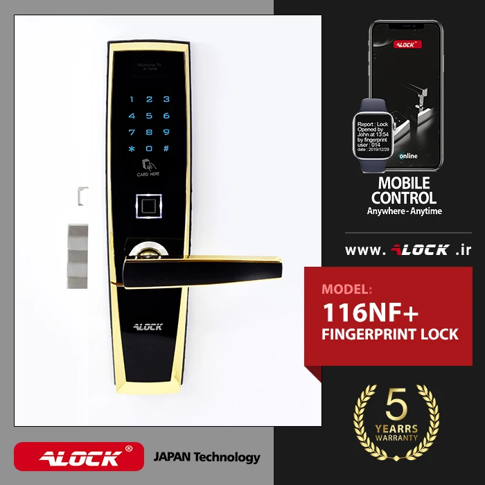 116NF + digital lock is one of the strongest and most powerful models of the 2018 ALOCK brand, which is designed and produced with a beautiful design, a very strong body and a powerful mechanical gearbox and metal material. The need of the country and residential and office projects for security and long-term strength with up-to-date technologies has led to special designs in the ALOCK electronic lock industry. One of the features of the 116NF + handle is the powerful mechanical gearbox with the ability to double the driving force and the high strength of the handles, body and main structure of the product. Saving a large number of users and full control and access to locks from anywhere in the world by mobile phone is one of the special features of ALOCK online products. This lock is designed and manufactured with parts made in Japan, which has increased the life of this product compared to other products on the market. The body of this handle is made of completely metal parts, which has made it much more durable than other brands in the market. 116NF handle + has the ability to store 100 fingerprints for 360 degrees, 400 direct users (offline) and more than 1 million indirect users (online). Reporting the entry and exit of people by mentioning the name, additional and removing mobile users from anywhere in the world, defining time-consuming one-time passwords for users with different access levels such as babysitter, caretaker, employees with different contract periods, passwords Imaginary function to prevent being hacked by others, confirming two-step entry, pass mode and free movement for busy times such as parties and ...