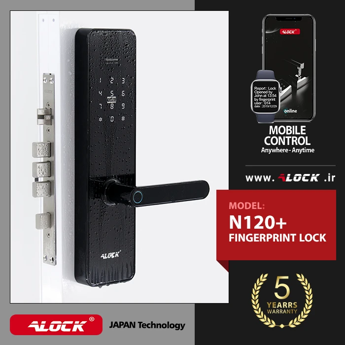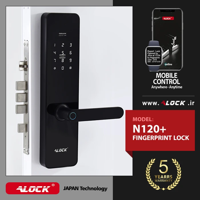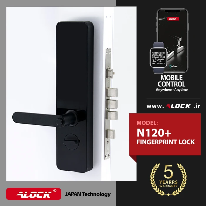 The N120 + digital lock is designed and manufactured based on the anatomy of the body and the structure and anatomy of the hand. This special design has made this model popular due to its digital locks, which use localized scanners. The need of the country and residential and administrative projects for security with up-to-date technologies has led to special designs in the ALOCK electronic lock industry. One of the features of the N120 + handle is a beautiful and elegant design with ergonomic biometric scanner type. This lock is designed and manufactured with parts made in Japan, which has increased the life of this product compared to other products on the market. The body of this handle is made of completely metal parts, which has made it more durable than other brands in the market. The N120 has the ability to store 100 fingerprints, 200 direct users (offline) and more than one million online users. Reporting the entry and exit of people by mentioning the exact date and time of traffic, working with mobile, checking and controlling traffic on mobile and computer, defining time-consuming one-time passwords for users with different access levels such as babysitter, caretaker, interval staff Various contractual features, codes with imaginary function to prevent being hacked by others, confirming two-step entry, pass mode and free traffic for busy times such as parties, etc. are another feature of this product.