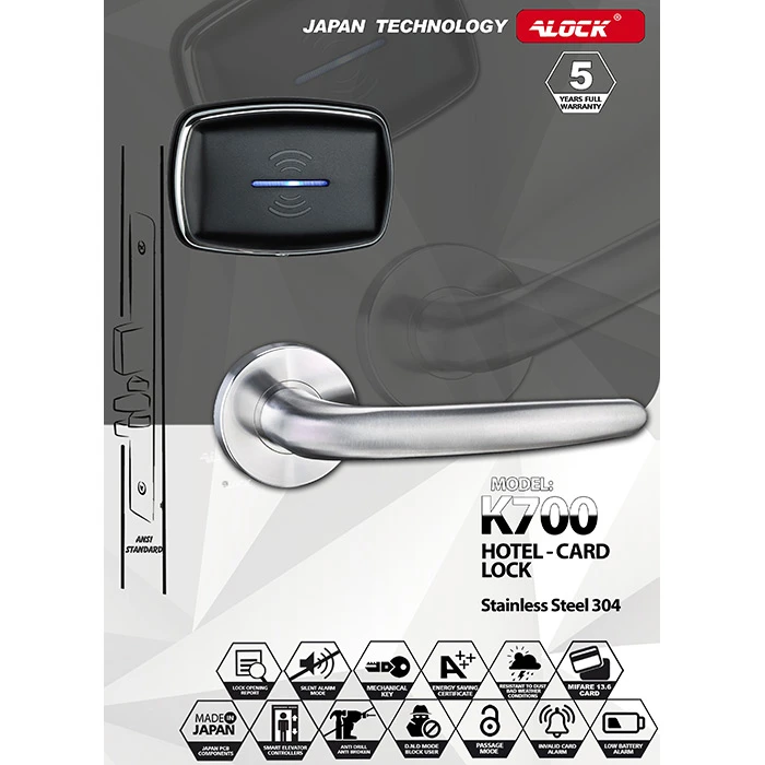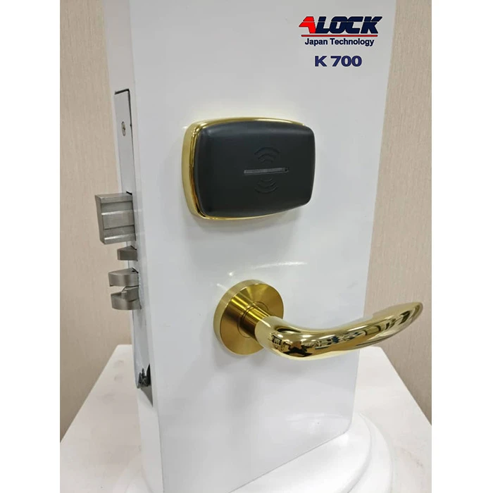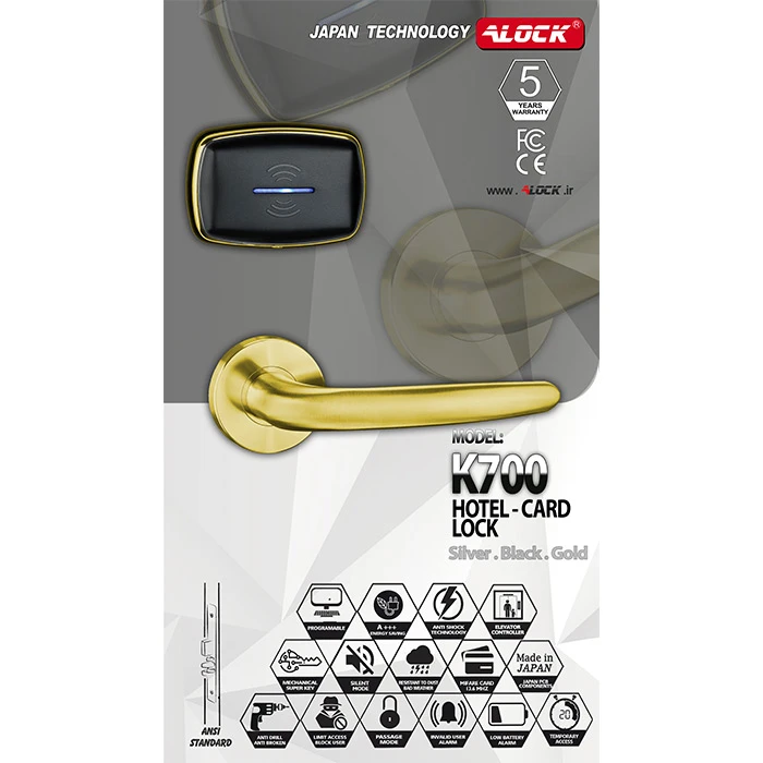 The ALOCK K700 hotel double handle is made of 304 steel. This model is one of the best-selling modern ones in the hotel group. This handle is made with Japanese-made parts. The body lock of this product is made of 304 alloy steel and steel. This product has different colors that can be customized by the buyer. The board technology of this product is Mifare 13.56 Mhz. The body is very strong and with the right metal material and the type of diestock used in the manufacture of this product, it has increased its strength and durability over a long period of time.