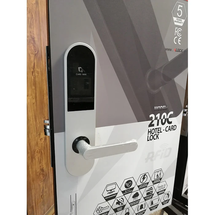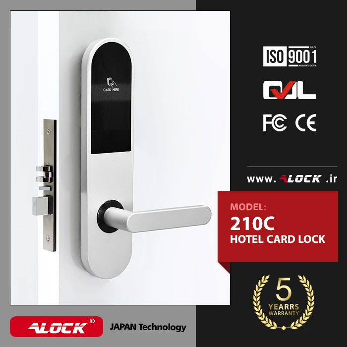 ALOCK 210C hotel card handle is one of the best sellers in the hotel group. This product is the most powerful hotel handle. The body of this product can handle a pressure of more than 500 kg. This product is made of full aluminum ingot with CNC cut. This handle is made with Japanese-made parts. The product body has a lifetime color warranty. The board technology of this product is Mifare 13.56 Mhz. The body of this handle is made of aluminum. The body is very strong and with a suitable metal material, and the type of die used in making this product has increased its strength and durability over a long period of time.