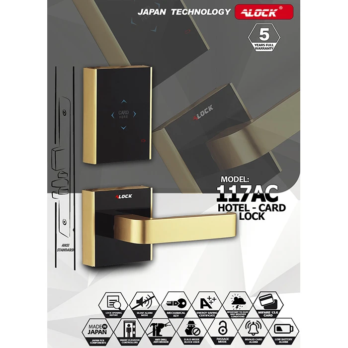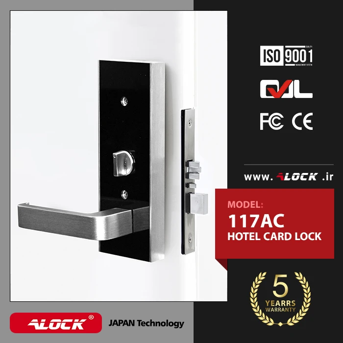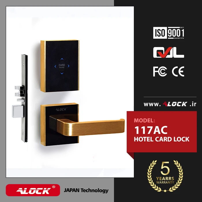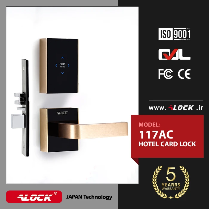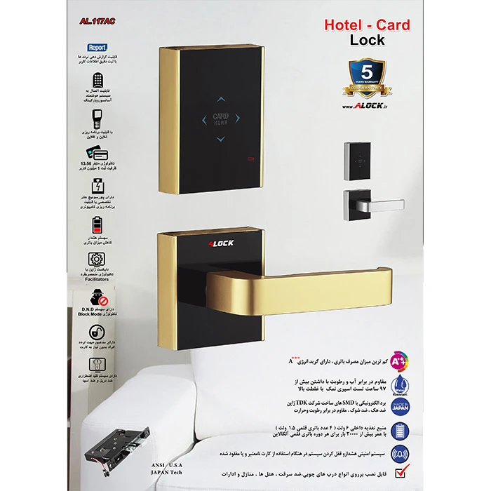 ALOCK 117AC two-piece hotel handle in the hotel group is one of the best-selling modern ones. This handle is made with Japanese-made parts. The body of the product has a color warranty from Mada Malmar. This product has different colors that can be customized by the buyer. The board technology of this product is Mifare 13.56 Mhz. The body of this handle is made of aluminum. The body is very strong and with a suitable metal material, and the type of die used in making this product has increased its strength and durability over a long period of time.